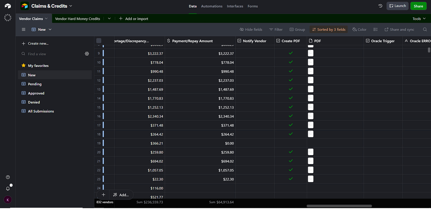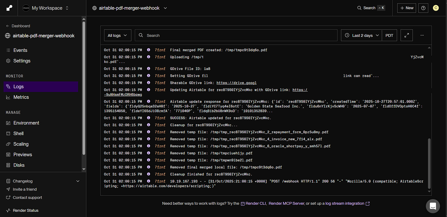 The first piece of software I used was Airtable. I actually don’t recommend Airtable because they’re money-grabbing pieces of shit, but my company is kind of obsessed with them. Regardless, I put all requested credits from vendors that fill out an online form into our Airtable database. From there, my accounting department can fill out extra information about the requested invoice. They then click the “create PDF” checkbox and my python script runs through Render.com.
